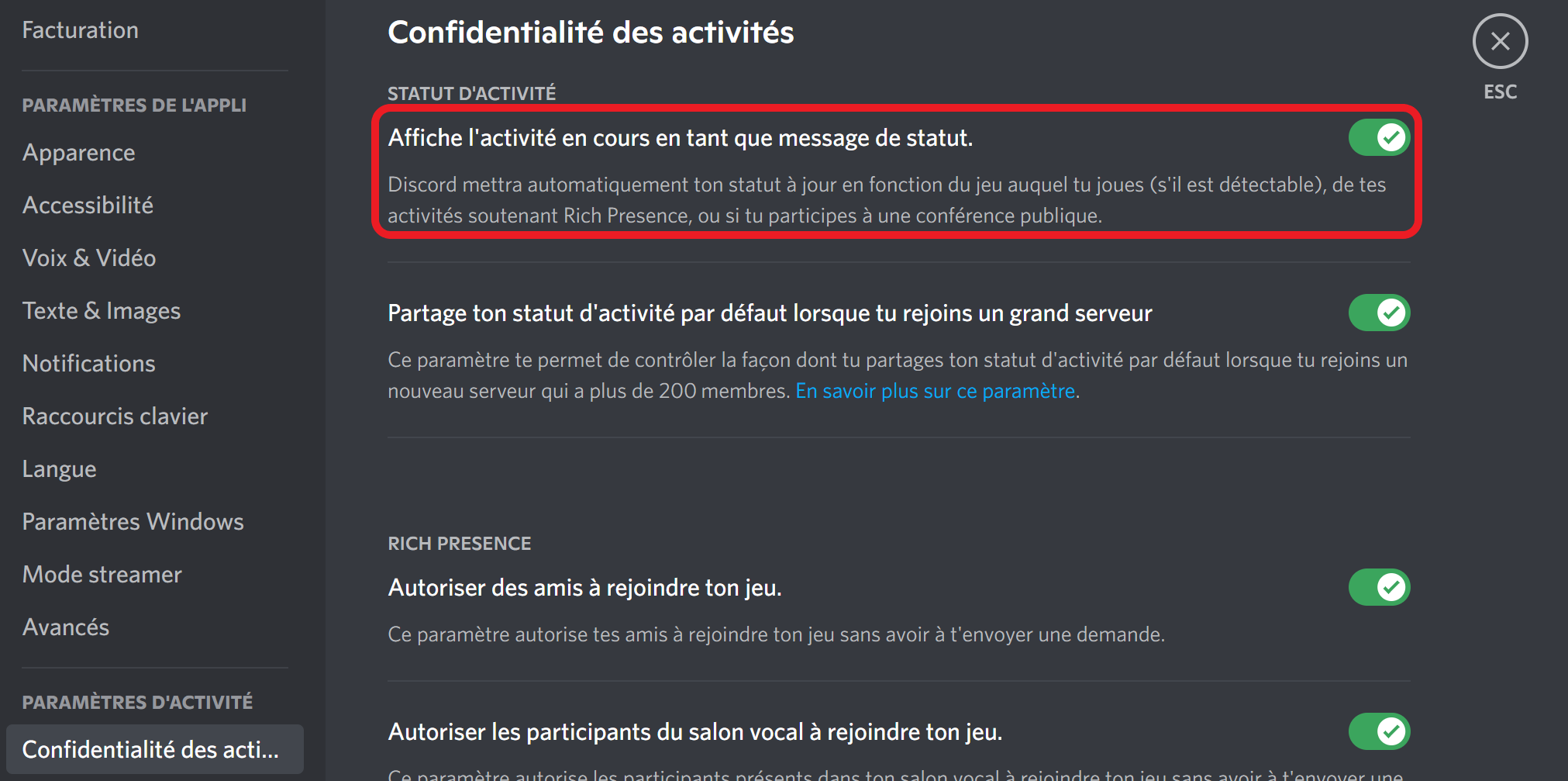 Avant la configuration, assurez-vous d'avoir activé le statut d'activité dans les paramètres Discord: