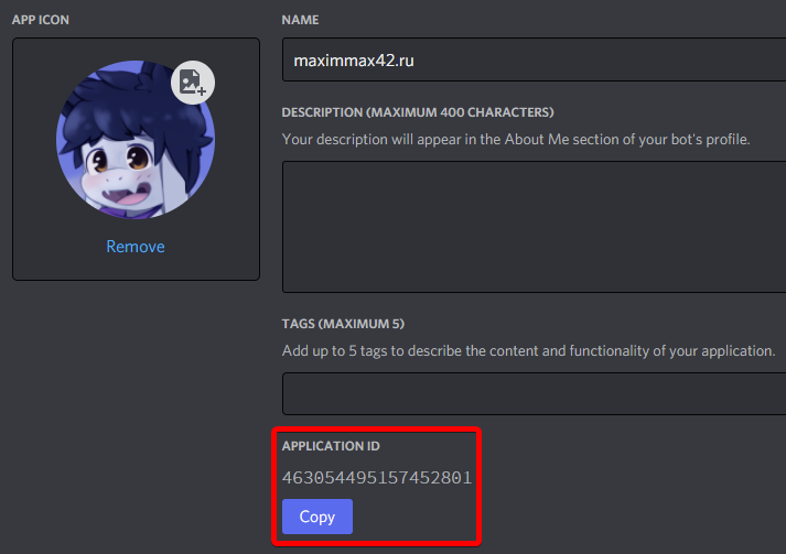 Choisir un nom pour l'application, il sera affiché après "En train de jouer" dans le statut ; appuyez sur Create.