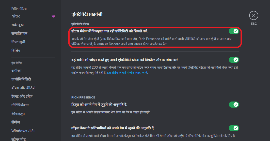 सेटअप करने से पहले, सुनिश्चित करें कि आपके पास एक स्थानिक डिस्कॉर्ड क्लाइंट (ब्राउज़र में नहीं) है और डिस्कॉर्ड सेटिंग्स में गतिविधि स्थिति को सक्षम कर दिया है: