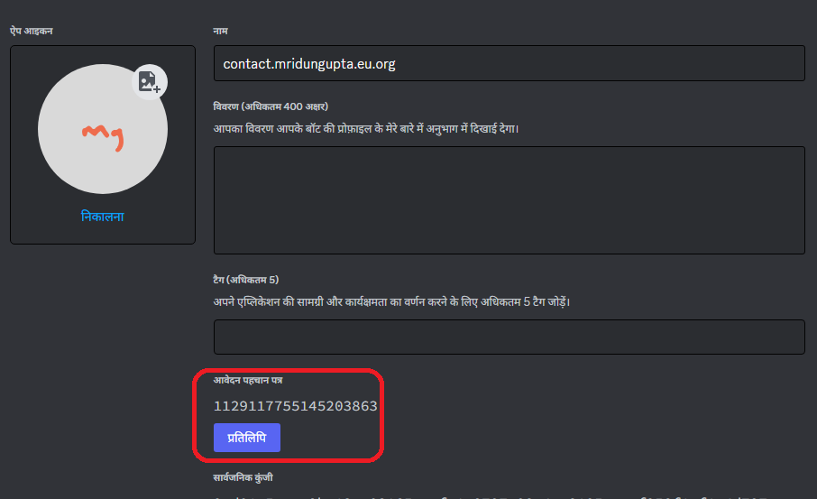 अपने एप्लिकेशन के पृष्ठ पर जाकर, फ़ील्ड State, Details, Large Image Key, Large Image Text, Small Image Key, Small Image Text, Party Size, Party Max को सेटअप करें। ये सभी वैकल्पिक हैं।
