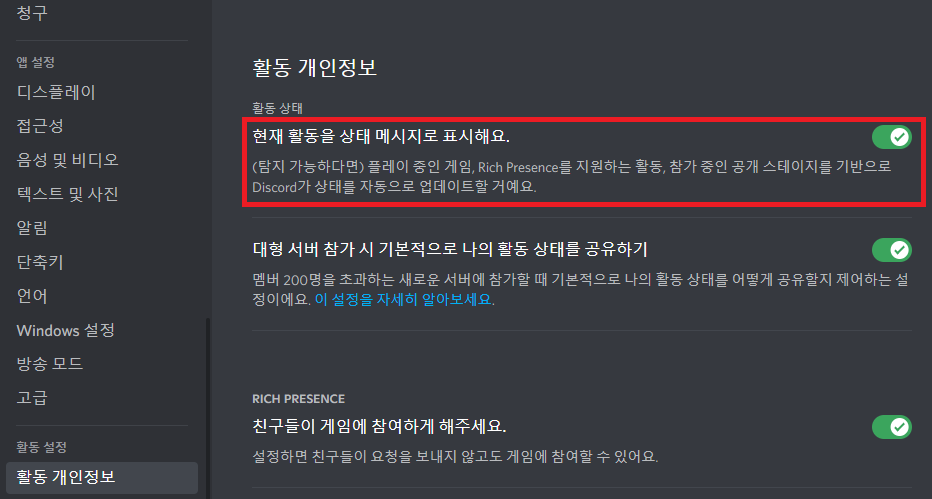 시작하기 전에, Discord 설정에서 활동 상태가 켜져 있는지 확인하세요: