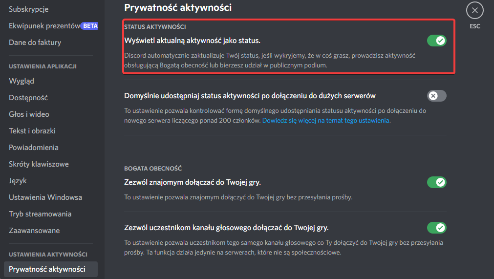 Upewnij się że masz włączony status aktywności w ustawieniach Discorda: