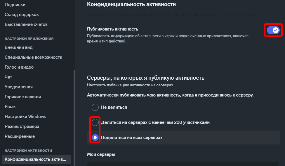 Перед тем, как начать настройку, убедитесь, что вы используете клиент Discord (не в браузере), а так же что публикация активности включена в настройках Discord: